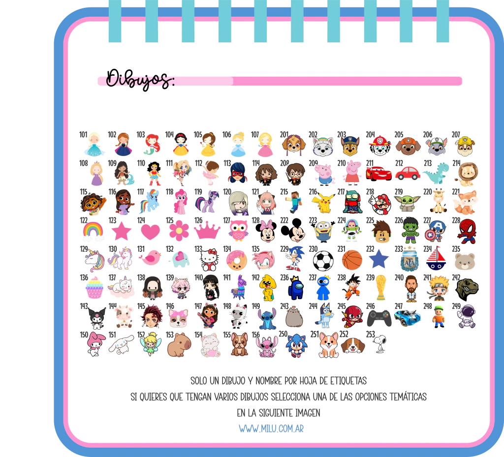 Por la cantidad de pedidos que se toman en la temporada escolar, y con el fin de agilizar los tiempos de entrega, no podemos mostrar uno a uno como queda antes de imprimir, por eso asegurate de escribir bien los datos, letra, diseño y dibujo seleccionado, nos comunicaremos con vos si hace falta algun dato como Nombre y personaje, en caso de no especificar el Fondo y Letra lo elegiremos nosotros